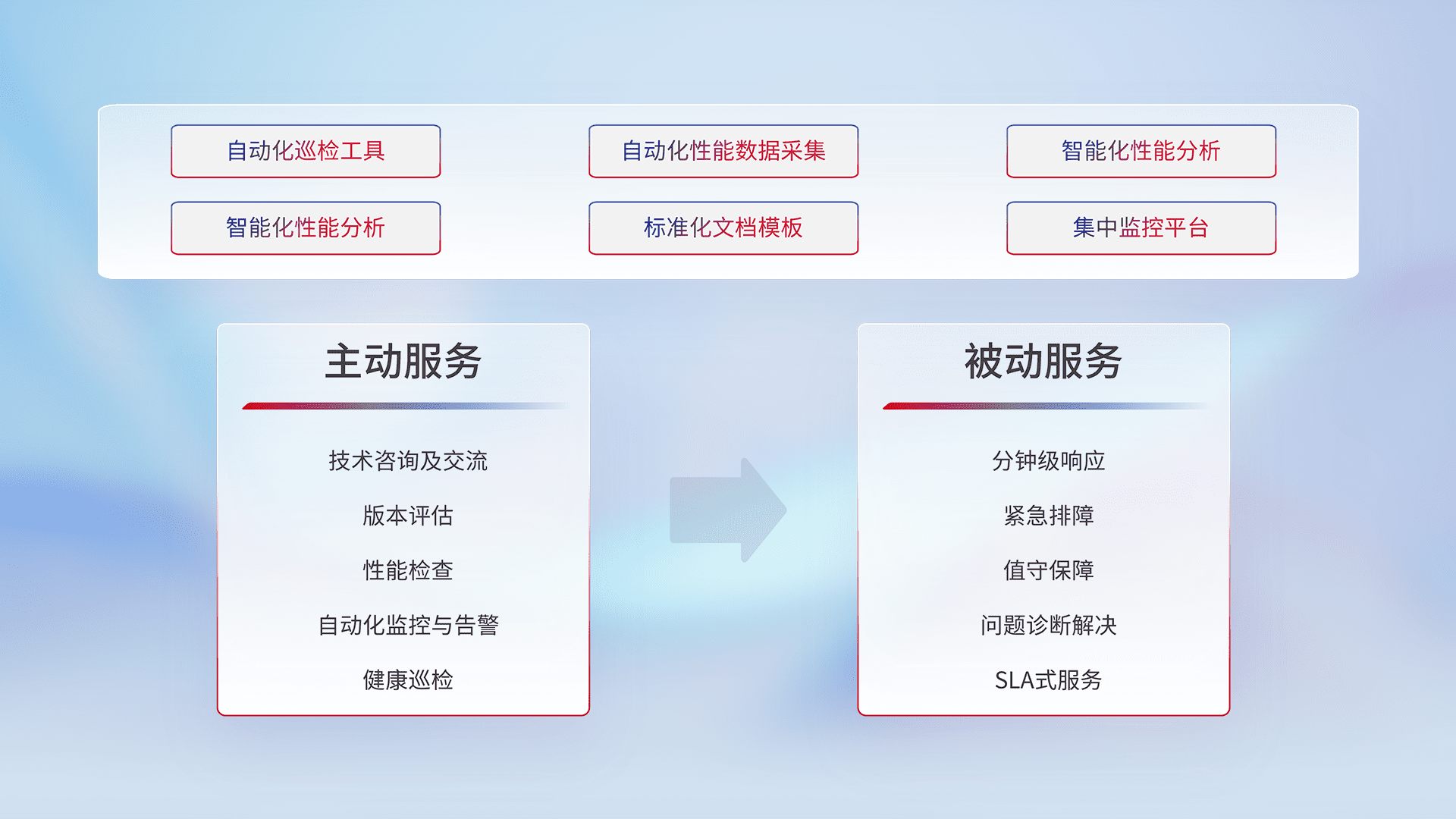 智能化工具和标准化文档,,,保障服务质量,,提供主动服务(包含技术咨询、、、版本评估、、、、性能检查、、自动化监控与告警、、健康巡检)和被动服务包含(分钟级响应、、、、紧急排障、、值守保障、、、、问题诊断解决、、、、SLA服务)。。。