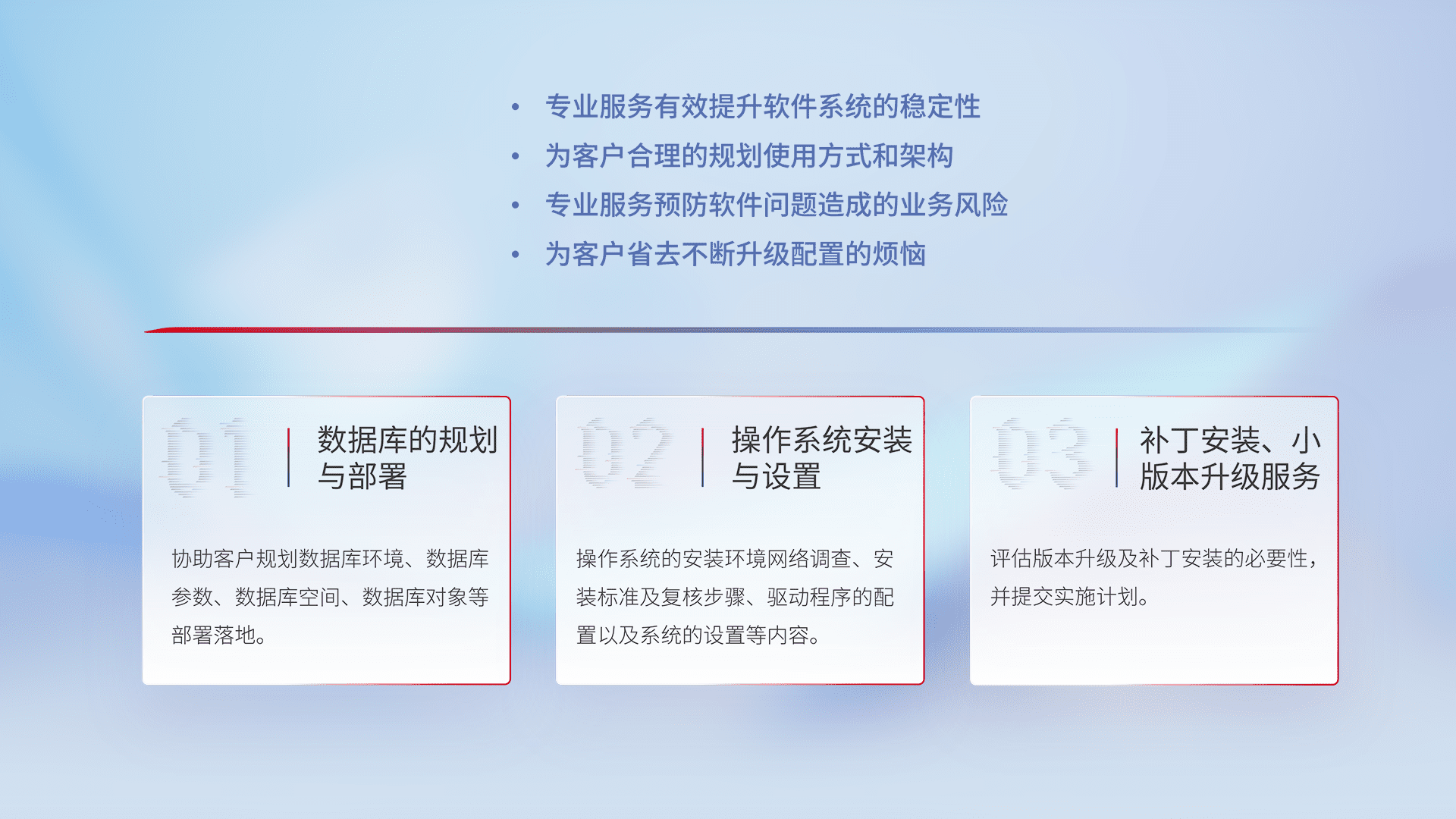 为客户提供软件规模升级、、、快速部署、、按需配置的专业服务,,从数据库的规划与部署到操作系统的安装与设置,,再到补丁安装和小版本升级提供支持。。。。