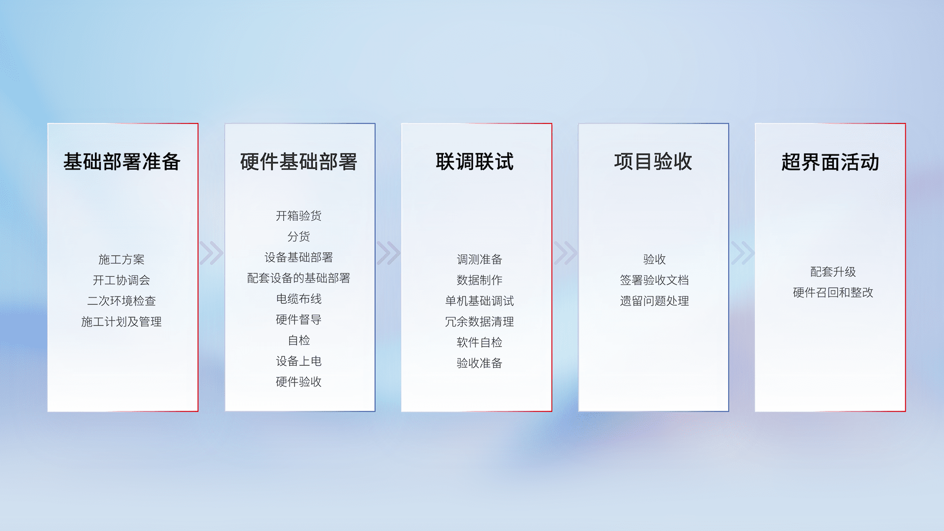 从基础部署准备、、、硬件基础部署、、联调联试、、、、项目验收、、越界面活动的全过程可追溯,,保证施工质量和进度。。。。
